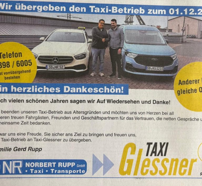 Im Dezember 2025 haben wir die Taxisparte der Firma Rupp übernommen. Wir danken für vertrauensvolle Gespräche und das Vertrauen dieses Unternehmen in die Zukunft führen zudürfen.